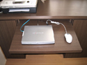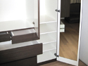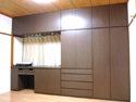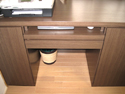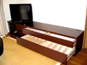 お子様がリビングに漫画本を持ち出したままにされ片付かないので、リビングのテレビ台を兼ねた収納スペースがほしいとの事でした。スライドレール三段引(*1)をつけ、お子様でも軽々と取り出しやすい大容量の収納を造りました。