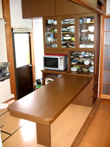 天井までのスペースにも、たっぷりと食器が収納できるように棚がついています。引出は取り出しやすい場所にあり、食器の出し入れもしやすいように工夫しています。台所の必需品の電化製品もコンパクトに収納できます。