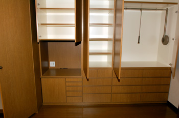 | イメージして下さい・・・。あなたの部屋に、テレビ台・洋服ダンス・整理タンス・押入れがあります。さて、どんな部屋ですか?家具の凸凹がすっきりせず、家具の隙間やタンスの上に箱や色々なものを積み重ねてホコリが・・・ | |