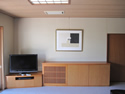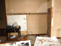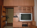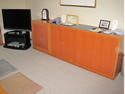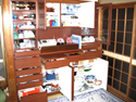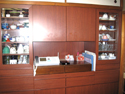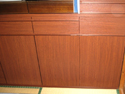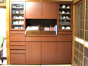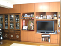 | 土壁に新築時から作り付けの飾台がついていたため、大型テレビを置くスペースがなくお困りでした。壁一面の壁面収納に造り替え、FAX・ビデオ・スピーカーや小物・写真等大切な物を飾るスペースと上部収納もできました。 |