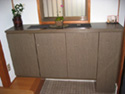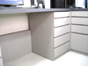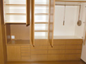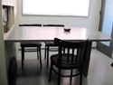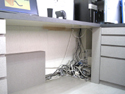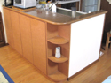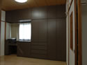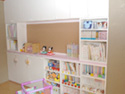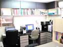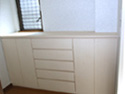 | 当社の事務所です。およそ4坪と狭い事務所ですが環境にあわせうまく配置する事で、3人同時に机で作業ができます。PCが増えてくるとかさばる配線もPCの真裏から机下に落とし、移動式のワゴンで見えないように隠してあります。 出し入れ可能のテーブルで最大7人まで打ち合わせする事ができ、横にはカタログとお客様のお荷物収納コーナーを設けました。 また、裏側は食器収納戸棚を兼ねており、流し台がお客様から見えない様になっております。 |